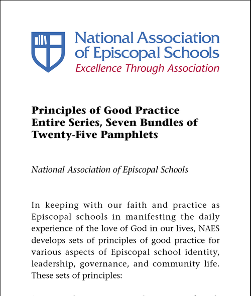 In keeping with our faith and practice as Episcopal schools in manifesting the daily experience of the love of God in our lives, NAES develops sets of principles of good practice for various aspects of Episcopal school identity, leadership, governance, and community life. This bundle deal contains 25 copies of each of the eight topics covered by the NAES PGPs.